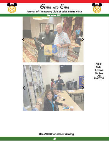 Gears and Ears Journal of The Rotary Club of Lake Buena Vista December 2023 November Photo Album - 1 2 November Meeting & 7 November First Tuesday 9 November Meeting Click Side Arrows To See All PHOTOS Use ZOOM for closer viewing. 24