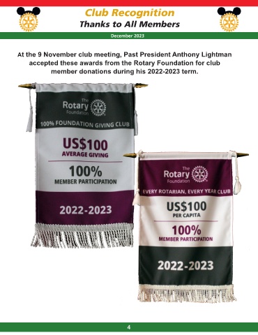 Club Recognition Thanks to All Members December 2023 At the 9 November club meeting, Past President Anthony Lightman accepted these awards from the Rotary Foundation for club member donations during his 2022-2023 term. 4