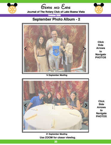 Gears and Ears Journal of The Rotary Club of Lake Buena Vista October 2023 September Photo Album - 2 Click Side Arrows to Navigate PHOTOS 14 September Meeting Click Side Arrows to Navigate PHOTOS 21 September Meeting Use ZOOM for closer viewing. 23