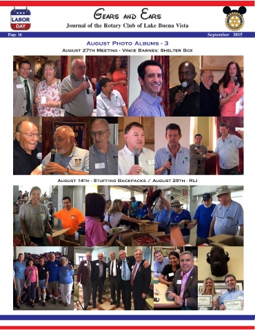 Gears and Ears Journal of the Rotary Club of Lake Buena Vista Page 16 September 2015 August Photo Albums - 3 August 27th Meeting - Vince Barnes: Shelter Box August 14th - Stuffing Backpacks / August 29th - RLI